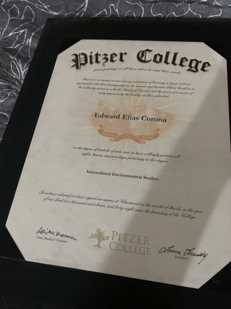 this is my diploma from Pitzer College. My degree is Intercultural Environmental Studies…